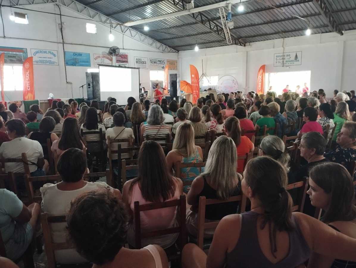 Vindas de diferentes comunidades do município, as participantes foram recepcionadas por um momento de espiritualidade coordenado pelo pároco Padre Inácio Fengler. A programação também contou com momentos de construção de conhecimento, reflexão e confraternização. A importância do autocuidado e de um seguro de vida para eventuais necessidades na vida das pessoas foi abordado pela representante da Cresol, Marina Somer.