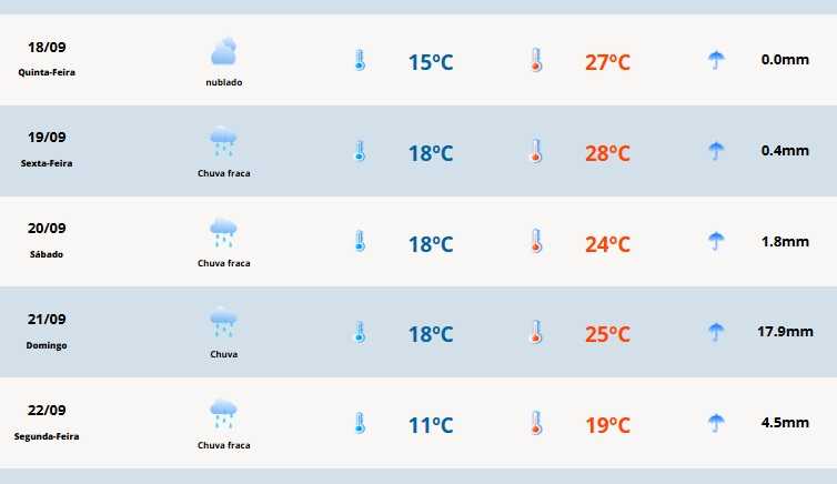 Em Cerro Largo a temperatura mínima será de 15°C e a máxima de 27°C.