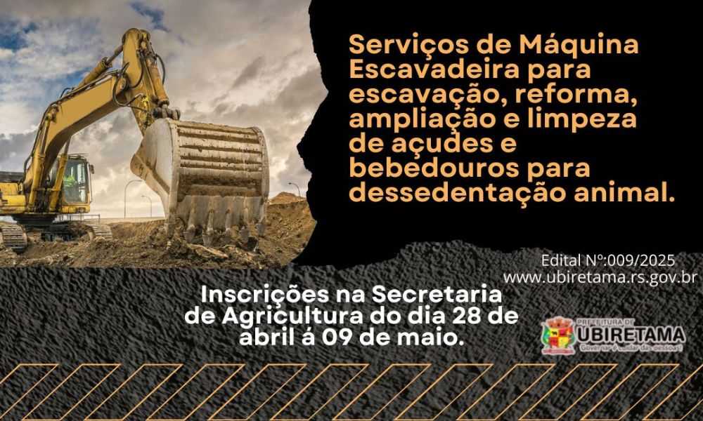 A Prefeitura Municipal de Ubiretama (RS), por meio da Secretaria de Agricultura e conforme disposto no Edital nº 009/2025, informa que estão abertas as inscrições para a seleção de Produtores Rurais interessados no recebimento de horas máquina destinadas à execução dos seguintes serviços: