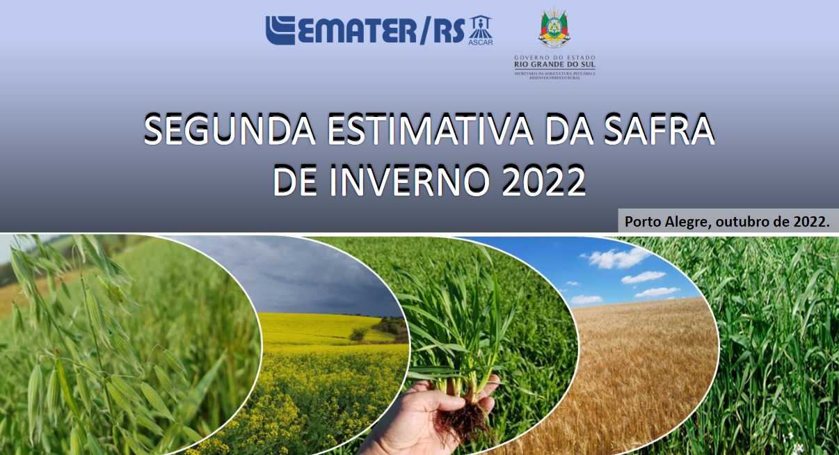 A Emater/RS-Ascar atualizou a estimativa da safra de inverno 2022, que deverá ser de 5.758.257 toneladas, 27,4% maior do que a safra anterior, juntando trigo, aveia branca, canola e cevada. Os dados foram coletados na segunda quinzena de setembro (16 a 30/09) em 358 municípios produtores de trigo, 200 de aveia branca grãos, 101 municípios que produzem canola e 75, cevada.
