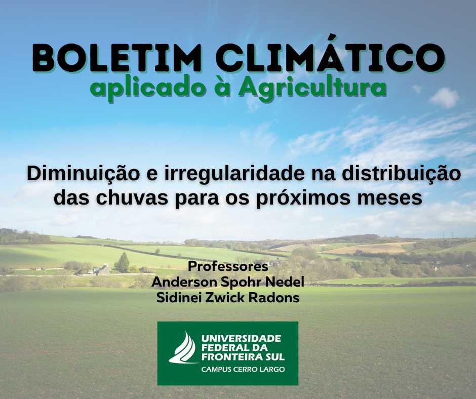 O boletim climático do trimestre agosto/setembro/outubro, elaborado pelos professores da UFFS- Cerro Largo, Anderson Spohr Nedel e Sidinei Zwick Radons, mostra que a condição de neutralidade climática (sem a influência de El Niño ou La Niña) continua presente sobre o Rio Grande do Sul.