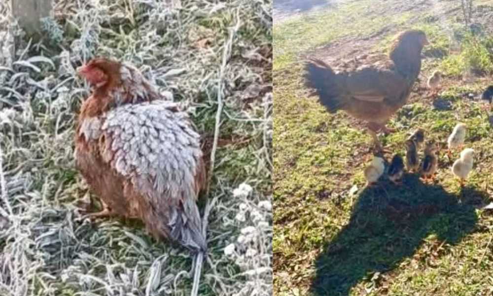 Em imagem enviada para a Rádio RDX, é possível ver uma camada de gelo entre as penas da galinha, e os pintinhos estavam protegidos embaixo de suas asas.