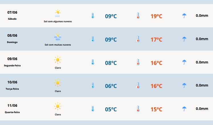 Domingo - No domingo, áreas de instabilidade provocam aumento de nuvens na Metade Norte desde cedo e isso impede o declínio da temperatura. Com isso as mínimas ficarão mais altas na faixa de 11°C a 13°C.