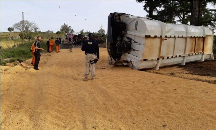 O veículo, além de ter esparramado sobre a rodovia toda a carga de soja, derrubou uma árvore, que caiu sobre a pista, bloqueando completamente o trânsito. O condutor, de 30 anos, residente em São Luiz Gonzaga, não se feriu.