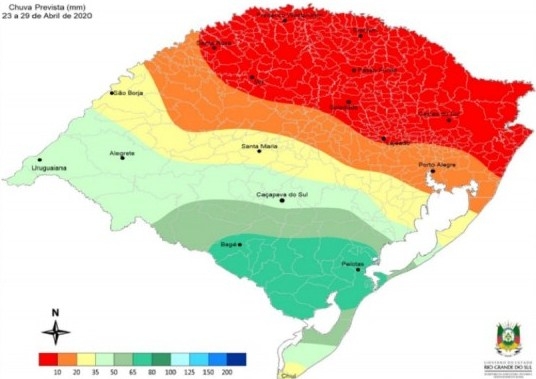 A maioria das regiões do Rio Grande do Sul deve ter chuva nos próximos sete dias, de acordo com o Relatório Oficial nº 15, elaborado pela Secretaria da Agricultura, Pecuária e Desenvolvimento Rural (Seapdr), Emater-RS e Instituto Rio Grandense do Arroz (Irga).