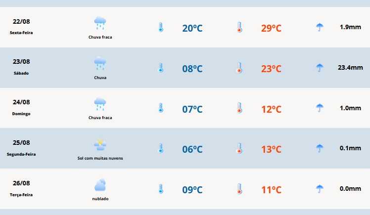 Em Cerro Largo a temperatura sobe, com mínima de 20°C e máxima de 29°C.