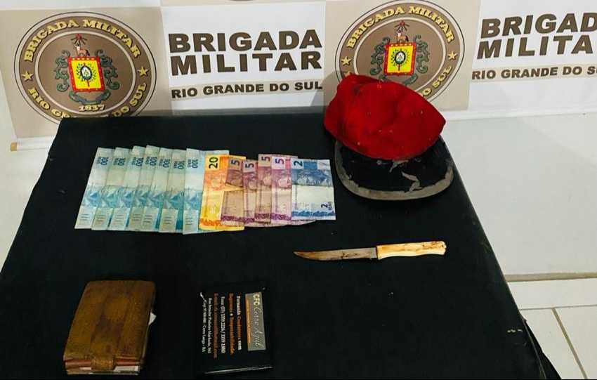 Com o homem foram recuperados R$ 747,00 em espécie e as carteiras com documentos pessoais, levados das vítimas, e apreendida a faca utilizada no roubo.