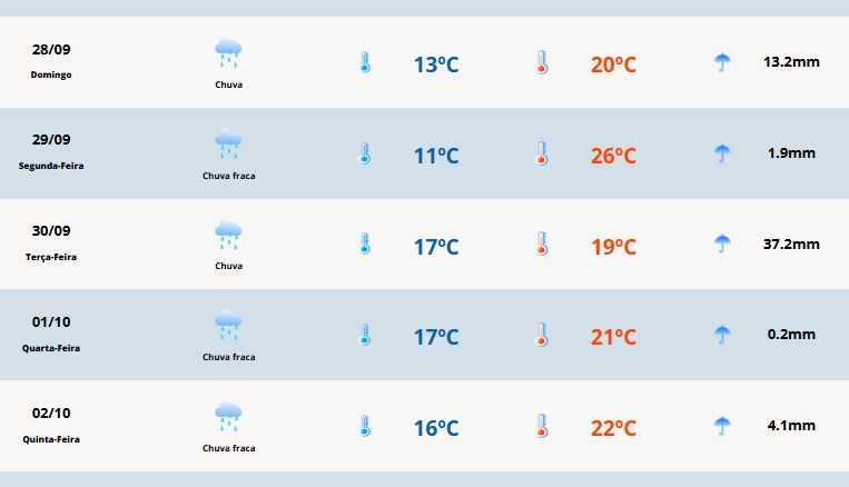 No Oeste, Centro e Sul, após um início de dia chuvoso, a instabilidade se afasta e o tempo vai melhorar com sol e nuvens. A temperatura vai estar agradável neste último domingo de setembro.