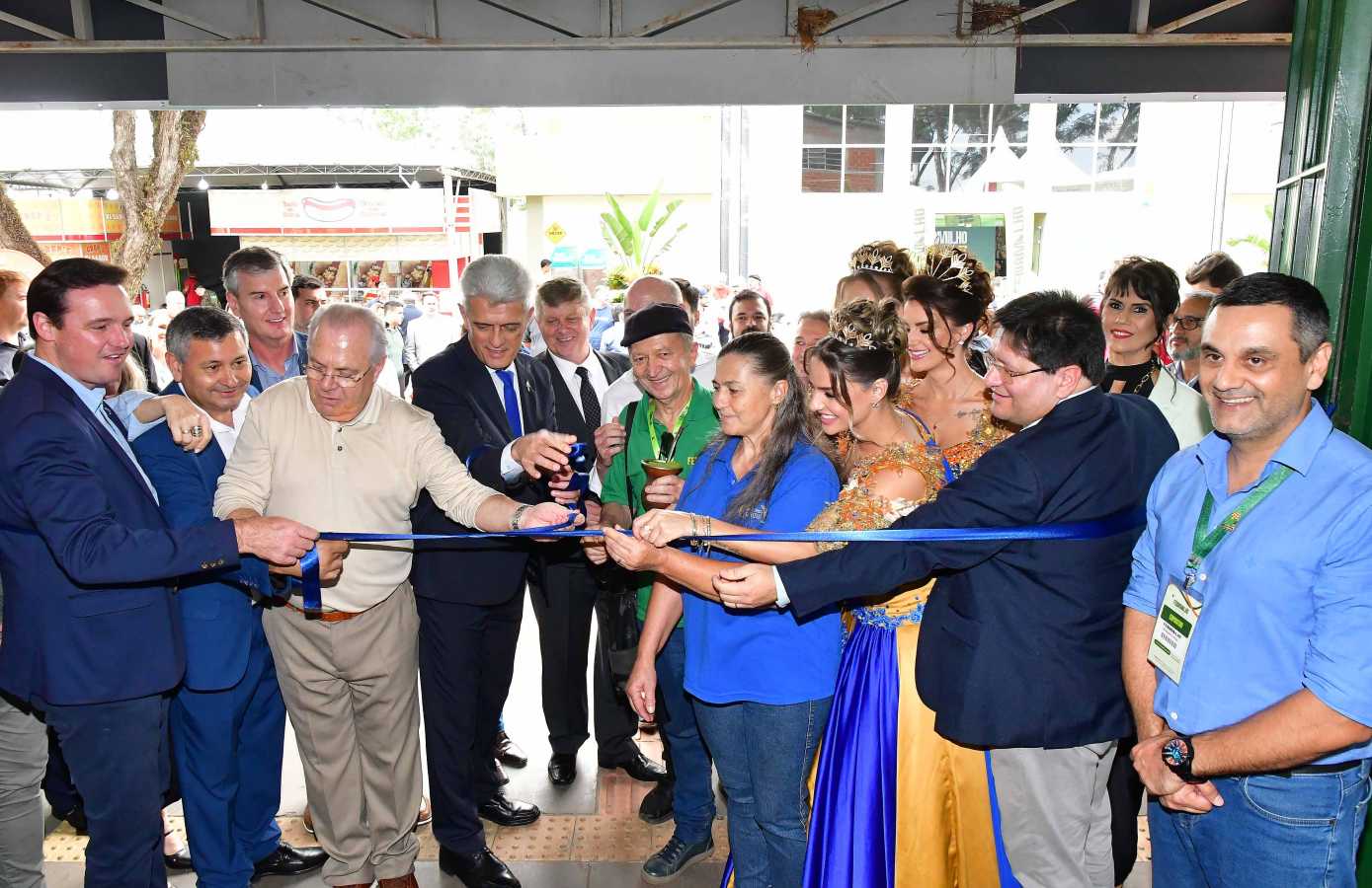 O secretário estadual de Desenvolvimento Rural, Vilson Covatti Filho, ao lado de lideranças como o deputado federal Elvino Bohn Gass, o deputado estadual Eduardo Loureiro, o prefeito Nívio Braz e o presidente da Fenamilho, Luis Alberto Voese, participaram da abertura do Pavilhão da Agricultura Familiar, marcando a destinação de R$ 160 mil para 32 expositores do setor.