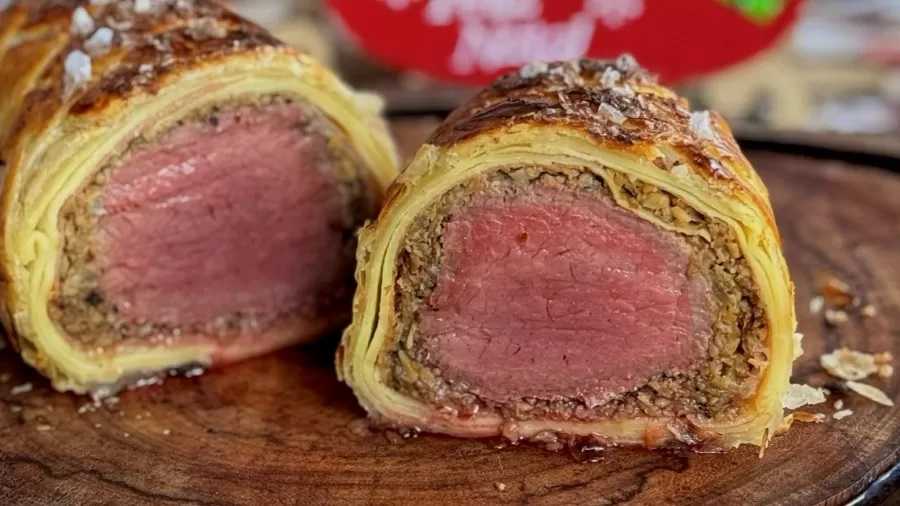 7. Por fim, o conjunto é envolvido em massa folhada aberta, fechada firmemente para criar uma crosta dourada. A massa é pincelada com gema de ovo, garantindo um acabamento brilhante e dourado. O Bife Wellington vai ao forno preaquecido a 200°C e assa por 25 a 30 minutos, até que a massa esteja perfeitamente crocante.