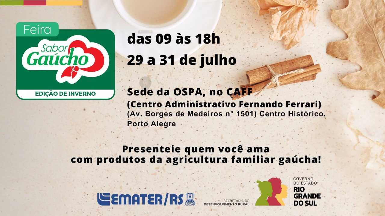 Com a chegada do frio, está aberta a temporada de aconchego, sabores marcantes e tradição. É nesse clima que acontece a Feira do Sabor Gaúcho: Edição de Inverno, um espaço que celebra a gastronomia e a cultura do Rio Grande do Sul, entre os dias 29 e 31 de julho, em Porto Alegre. O objetivo é destacar o protagonismo da agroindústria familiar gaúcha. O evento acontece no Centro Administrativo Fernando Ferrari (Caff) e se propõe a aproximar o público urbano dos empreendimentos do interior do Estado.