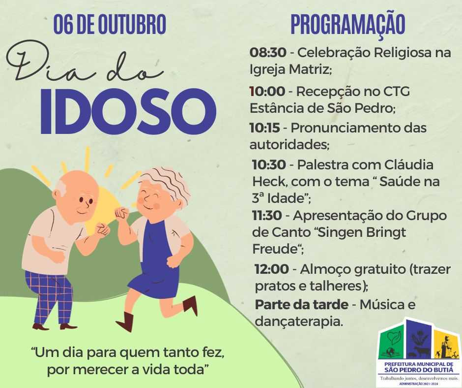 A Administração Municipal de São Pedro do Butiá, a Secretaria Municipal da Saúde e Assistência Social, juntamente com o Conselho Municipal do Idoso e a Emater-RS/Ascar, convidam todos os idosos par participarem da programação alusiva ao Dia do Idoso, que acontecerá nesta sexta-feira, dia 6 de outubro de 2023, no CTG Estância de São Pedro.