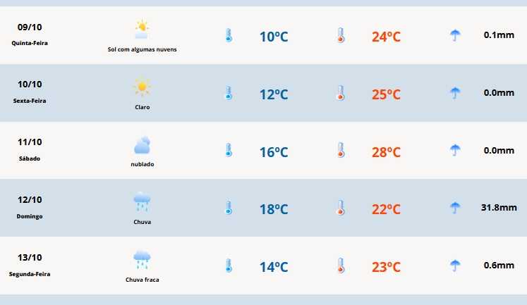 A quinta-feira (9/10), será mais um dia de tempo firme sob a influência de uma massa de ar seco e de alta pressão atmosférica.