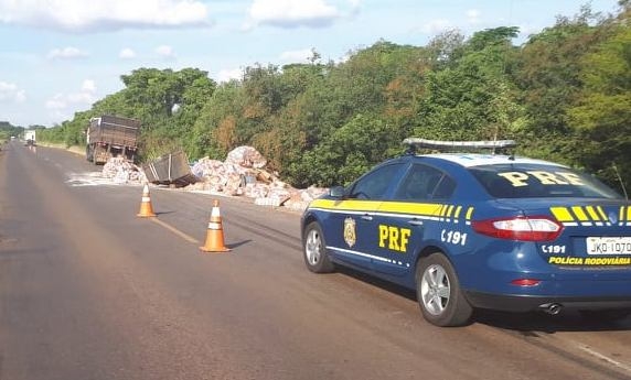 Durante a tarde de sexta-feira (29), a equipe da Polícia Rodoviária Federal (PRF) manteve-se sinalizando um acidente ocorrido no Km 670 da BR 285, nas proximidades da Unidade Operacional da PRF, onde uma carga de arroz derramou depois que a tampa lateral de uma carreta quebrou.