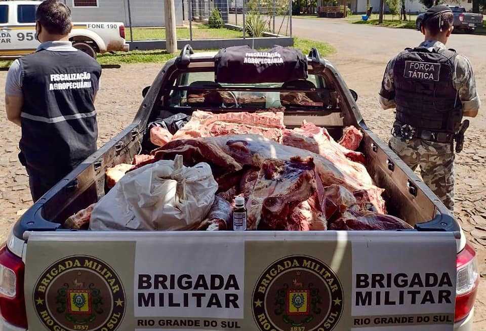 A guarnição da Operação Hórus, após receber denúncias de comercialização de carne de maneira ilegal, realizou uma ação conjunta com a Inspetoria Veterinária, no qual foi constado no local, carne imprópria para consumo, odor forte, sem procedência e o estabelecimento sem alvará.