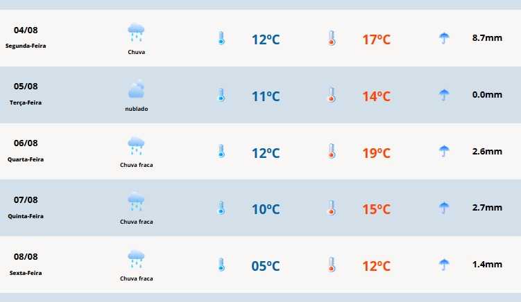 Em Cerro Largo a temperatura mínima será de 12°C e a máxima de 17°C.