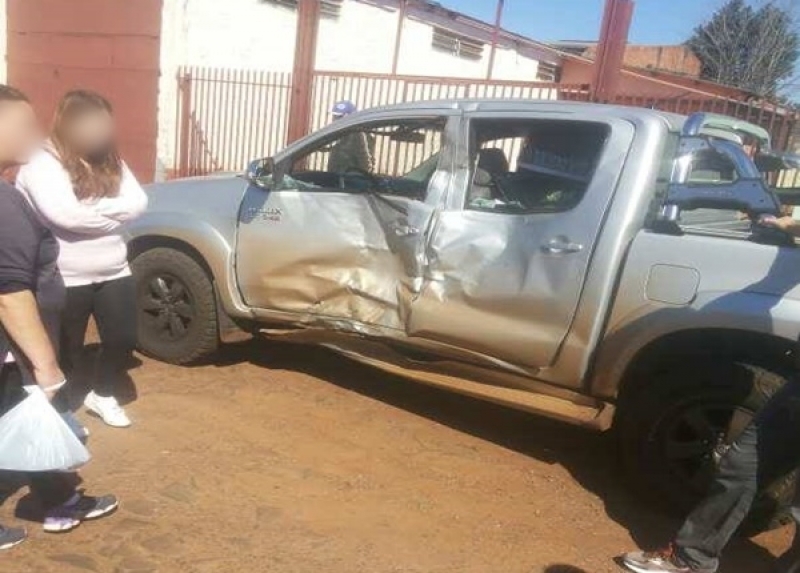A moto colidiu na lateral da camionete, causando grande dano na lataria e coluna do veículo.