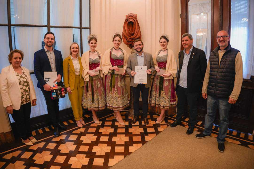 Um dia intenso de agendas marcou a terça-feira, 11 de julho, da comitiva que representou a Oktoberfest Missões em Porto Alegre. Formada pelo presidente do evento, Adriel Schardong, pela vice-presidente Jordana Griebeler Moscon, pelas soberanas Luísa, Bárbara e Fernanda, pelo prefeito Paulo Kipper de Almeida, pelo secretário da Indústria Comércio e Turismo, Vanderlei de Castro e pela vereadora Marta Schoffen, o grupo realizou visitas, convites e buscou recursos para a realização da festa, que acontece de 10 a 15 de outubro em Cerro Largo.
