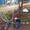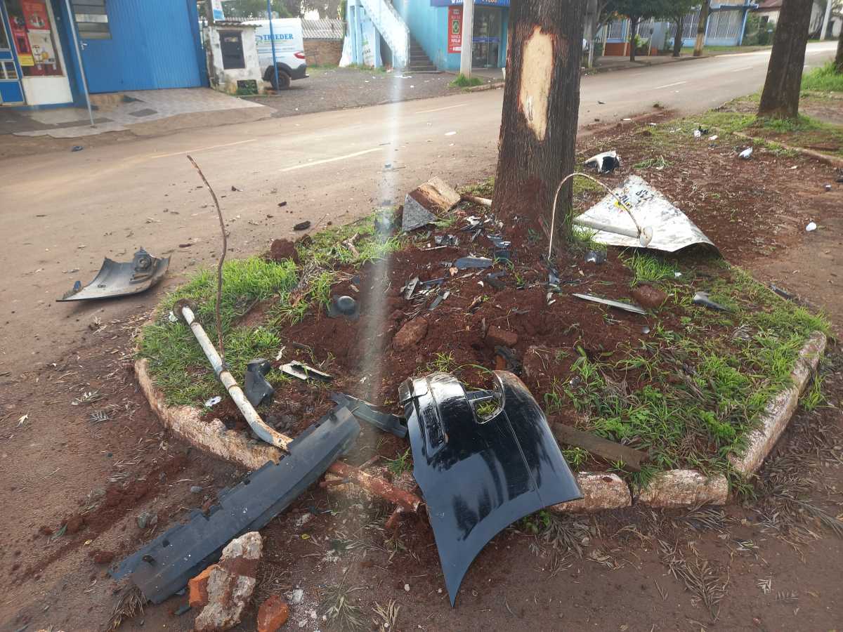 Um automóvel Citroën C4 bateu numa árvore, localizada no canteiro central, em frente ao Supermercado Strieder.