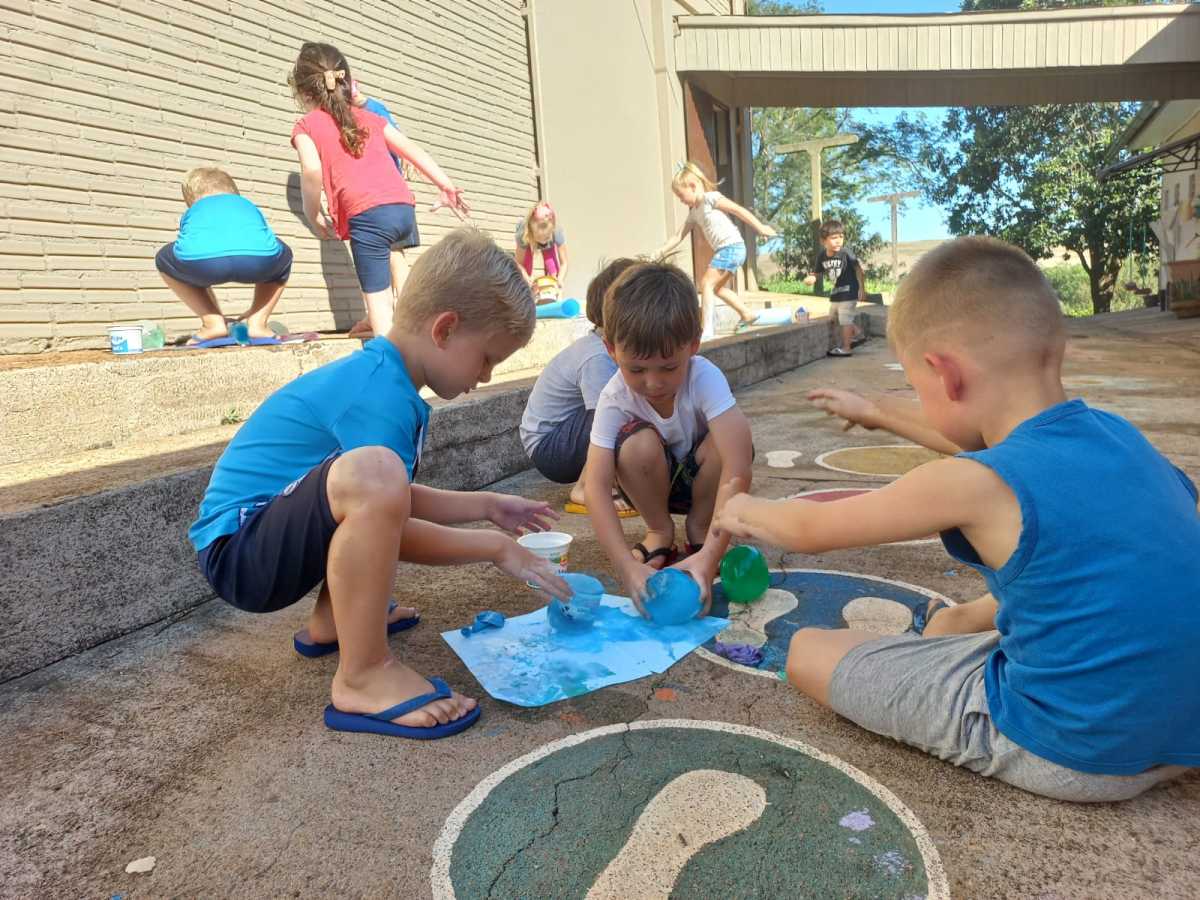 Alunos do Pré A da Escola Municipal de Ensino Fundamental São Francisco de Borja, acompanhados da professora Jocelaine, trabalhou nos últimos dias diversas abordagens importantes e necessárias sobre a água: letra A da água com traçados, recorte e colagem, escrita espontânea e modelagem, desenho com giz de lousa e água, números e a relação com as quantidades, histórias e experiência sobre a evaporação da água em casa e na natureza, e brincadeiras com água no seu estado sólido, com muito gelo colorido e surpresas escondidas.