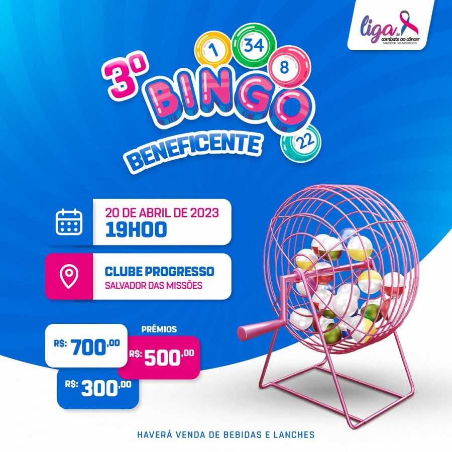 O Clube Progresso, em Salvador das Missões, sedia no dia 20 de abril, a partir das 19h, um Bingo Beneficente em prol da Liga de Combate ao Câncer daquele município.