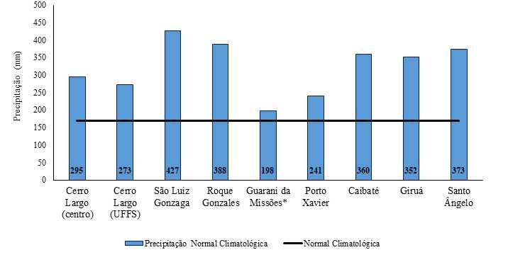 O boletim climático do trimestre Maio-Junho-Julho, elaborado pelos professores da UFFS-Cerro Largo, Anderson Spohr Nedel e Sidinei Zwick Radons apresenta a presença do fenômeno La Niña (região do Niño 3.4), com Temperatura da Superfície do Mar (TSM) mais fria que o normal. As precipitações no mês de março e abril ficaram acima da média nas Missões, na grande maioria dos municípios (Figura), ocorrendo de forma bastante expressiva, em algumas localidades. Em São Luiz Gonzaga foi observado o maior acumulado mensal, atingindo cerca de 2,5 vezes o valor normal para o mês.