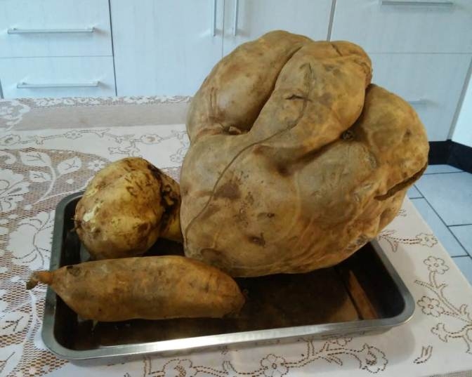Pois os leitores Carlos e Marlise Korb, residentes em Linha Taquarussú (Cerro Largo), nos enviaram essa foto, de uma batata-doce gigante colhida na propriedade, que pesou incríveis 10,5 quilos.