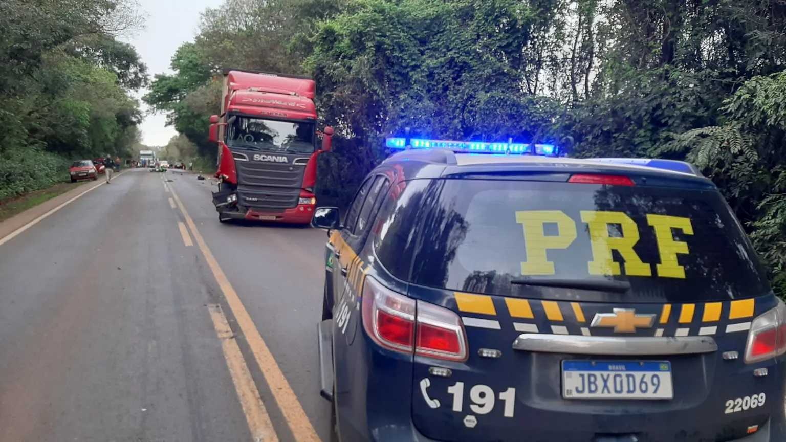 No ponto, uma carreta e uma moto colidiram, com o piloto da moto morrendo no local.