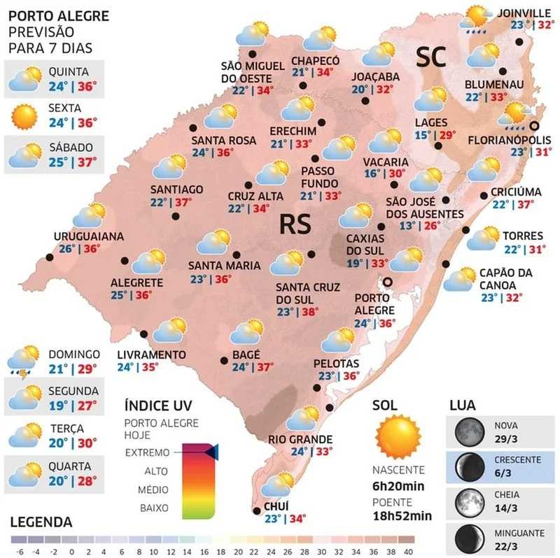 As regiões mais quentes seguirão sendo o Oeste, o Noroeste, o Centro, a Campanha, os Vales e a Grande Porto Alegre, onde as máximas nestes dias devem ficar, em geral, entre 36ºC e 39ºC na maioria das localidades. Porto Alegre deve ter entre 36ºC e 38ºC à tarde nestes três dias.