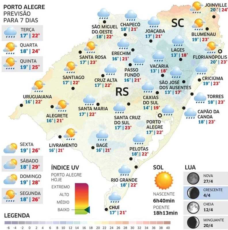 Em Cerro Largo, a temperatura deve ficar entre 18ºC e 22ºC, com previsão de pouca chuva.