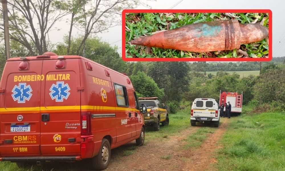 A Brigada Militar deslocou-se até a residência, onde foi isolado o local e feito contato com o morador. Ele relatou que encontrou o artefato na sanga, localizada na entrada de sua propriedade, submerso na água, o retirou e acionou a BM.