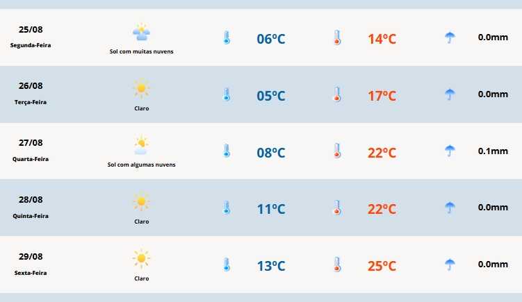 Conforme a MetSul, a segunda-feira (25/08) será marcada por frio nas primeiras horas do dia. De acordo com o prognóstico, o frio será mais intenso no Oeste e no Sul gaúcho pelo tempo aberto, o que traz geada para essas regiões. Já a tarde será fria na Metade Norte pela abundante nebulosidade.