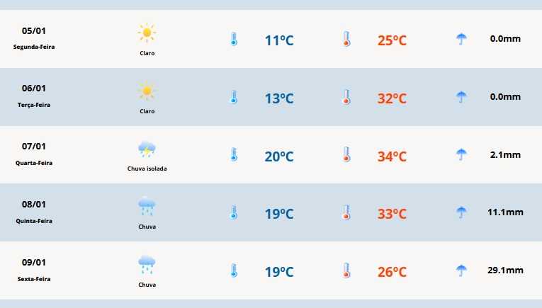 Em Cerro Largo, a temperatura mínima será de 11°C e a máxima de 25°C.