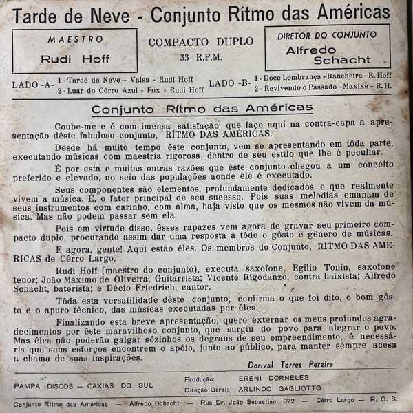 O compacto duplo Tarde de Neve (fotos na galeria abaixo), em 33 rotações por minuto, teve quatro canções gravadas, todas de autoria do maestro Rudi Hoff.