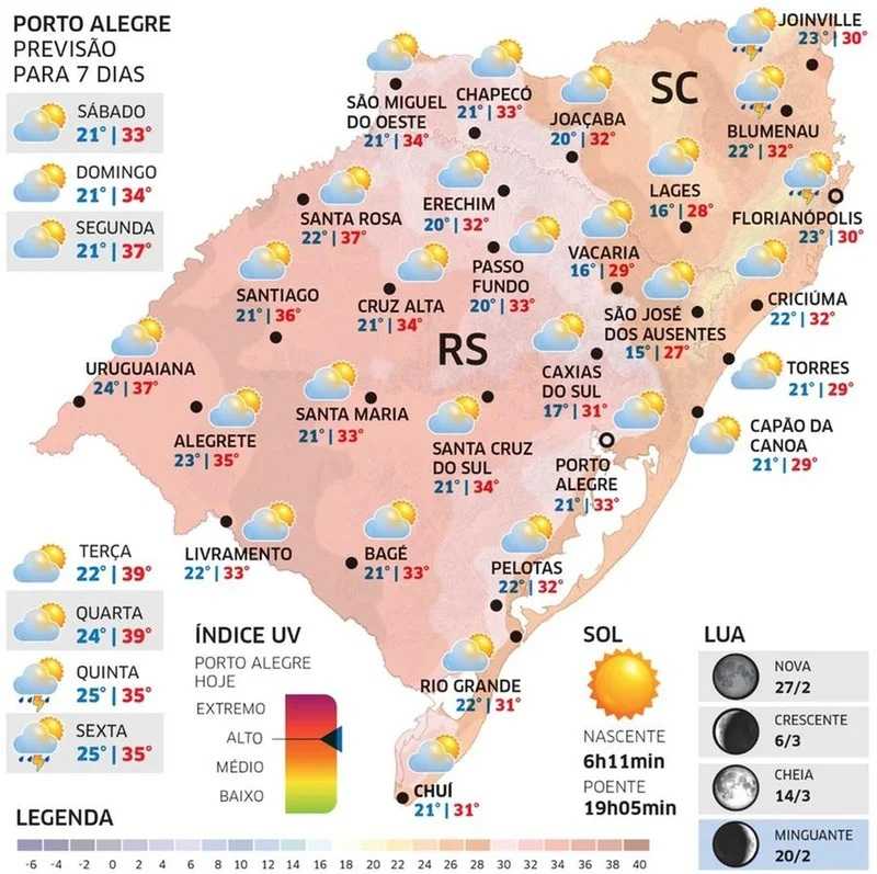 A massa de ar quente que cobre o território gaúcho se intensifica e o calor aumenta. Com exceção de pontos do litoral e dos Aparados da Serra, todas as demais regiões terão marcas acima de 30ºC e em várias cidades as máximas ficam ao redor e acima de 35ºC.
