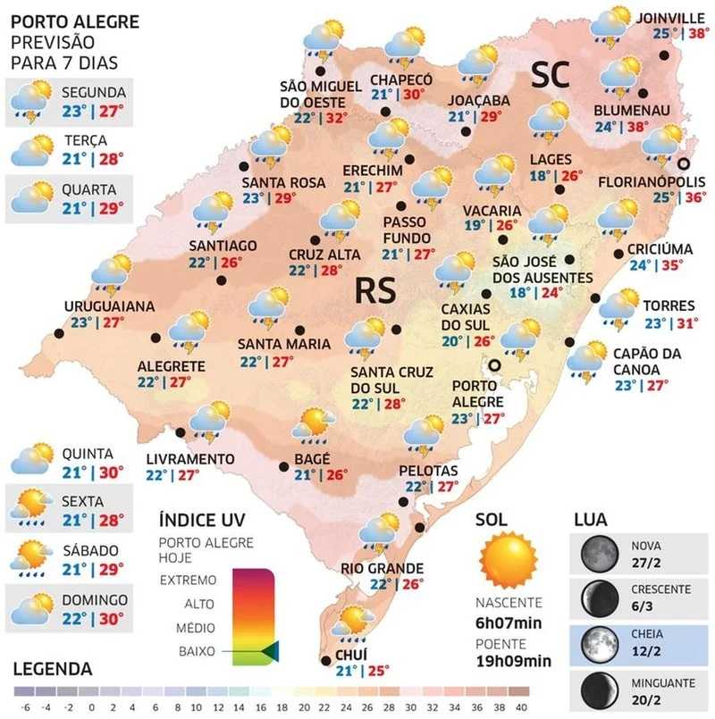 Há ainda probabilidade de temporais isolados com vendavais e granizo de variado tamanho. Alguns temporais podem ser localmente fortes a severos com danos. A instabilidade alcança cidades mais ao Norte do estado que no domingo não tiveram chuva e que seguem abafadas.