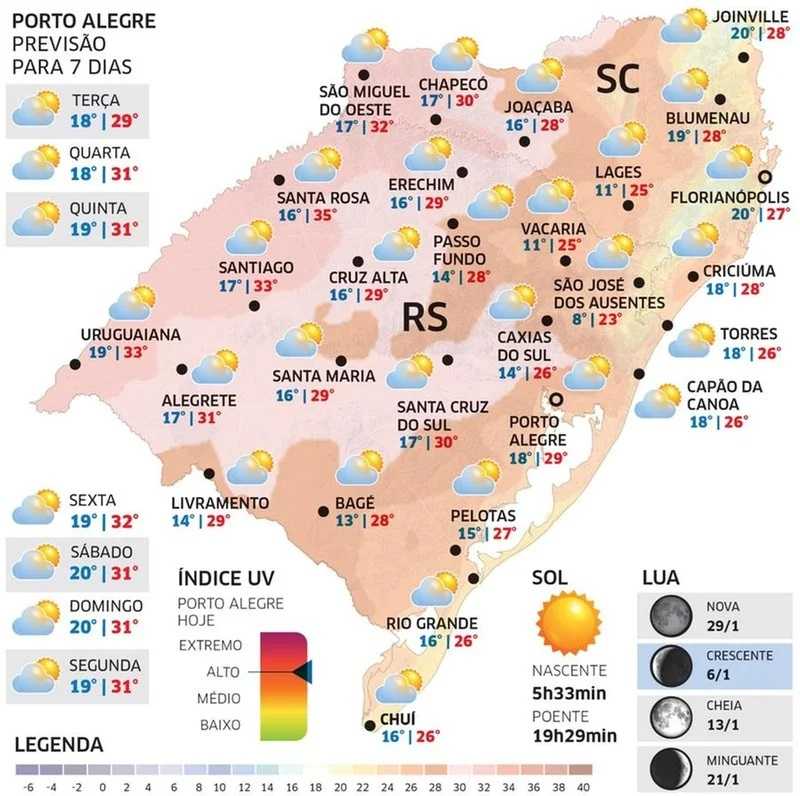 O tempo aberto com ar seco proporciona maior queda da temperatura durante a madrugada e o dia amanhece até um pouco frio para os padrões do auge do verão, sobretudo na Serra. Já a tarde é agradável no Sul e no Leste gaúcho enquanto no Oeste e no Noroeste o calor aumenta.