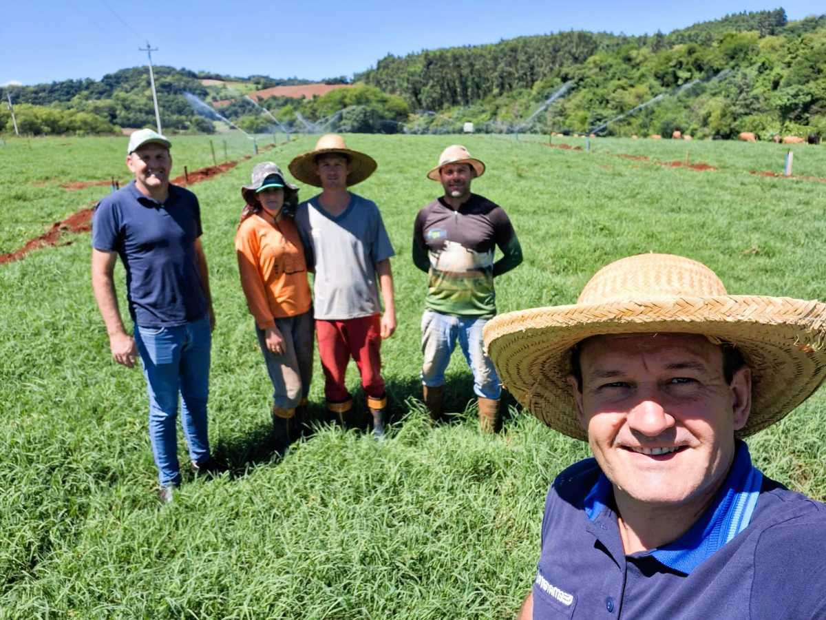 Em Nova Candelária, por exemplo, o sistema de irrigação por aspersão foi implantado na propriedade de Alexandre Luis Kroetz e Fabiele Baum em novembro deste ano, com o intuito de manter irrigada a área de três hectares com pastagem perene Tifton 85 e Jiggs.