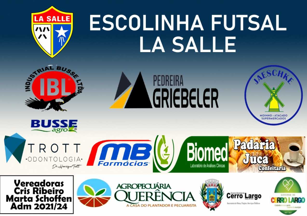 A Escolinha Futsal La Salle/ Pedreira Griebeler, por meio do coordenador Ricardo de Freitas e do professor Lucas Thomas de Freitas, agradecem às empresas que apoiaram o projeto Futsal com Boas Notas, realizado pelo décimo ano seguido, proporcionando a participação de crianças carentes nas atividades da escolinha, estimulando a sociabilização, o desenvolvimento motor e o bom rendimento escolar.