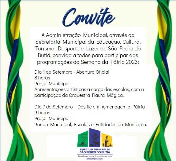 A Administração Municipal de São Pedro do Butiá, por meio da Secretaria da Educação, Cultura, Turismo, Desporto e Lazer, convida a todos para participarem das programações da Semana da Pátria 2023: