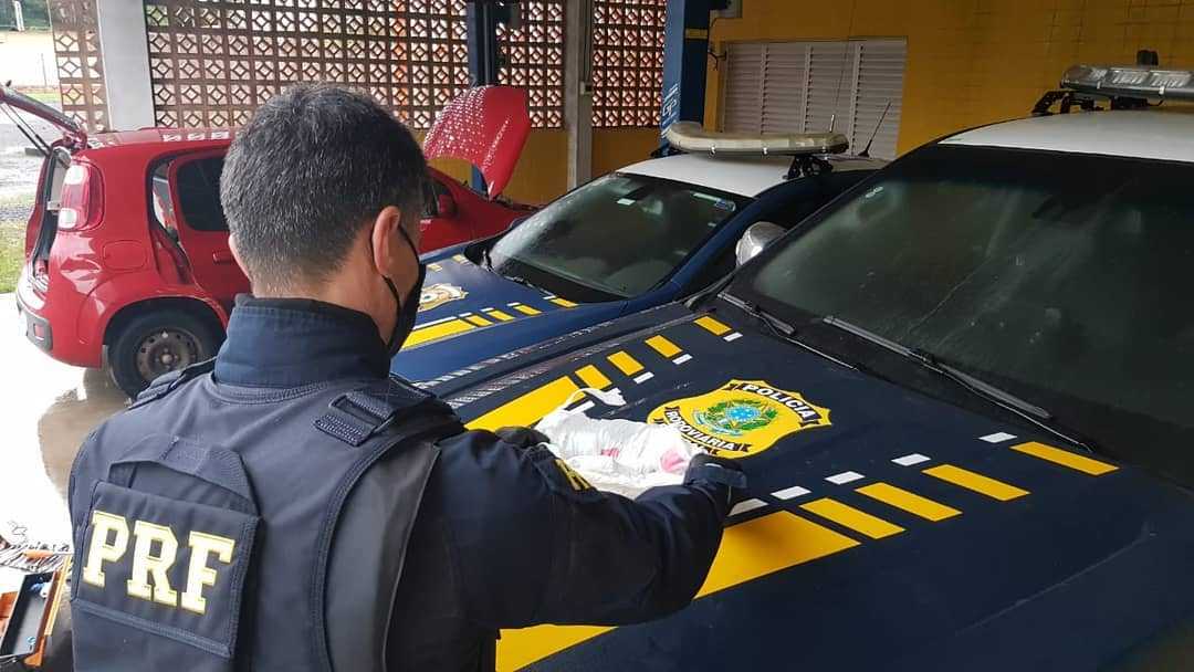 Durante ação de combate ao crime, agentes da PRF abordaram um Fiat Uno, e durante a fiscalização minuciosa no veículo, com emprego do cão farejador da Brigada Militar, foram encontradas 100 gramas de cocaína que estavam escondidas dentro do forro do veículo.