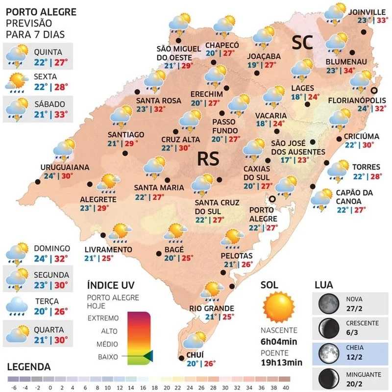 A atmosfera vai estar instável no Rio Grande do Sul nesta quinta-feira (13/02). Uma grande quantidade de nuvens cobre o estado no decorrer do dia, embora ocorram aberturas de sol em diferentes pontos.